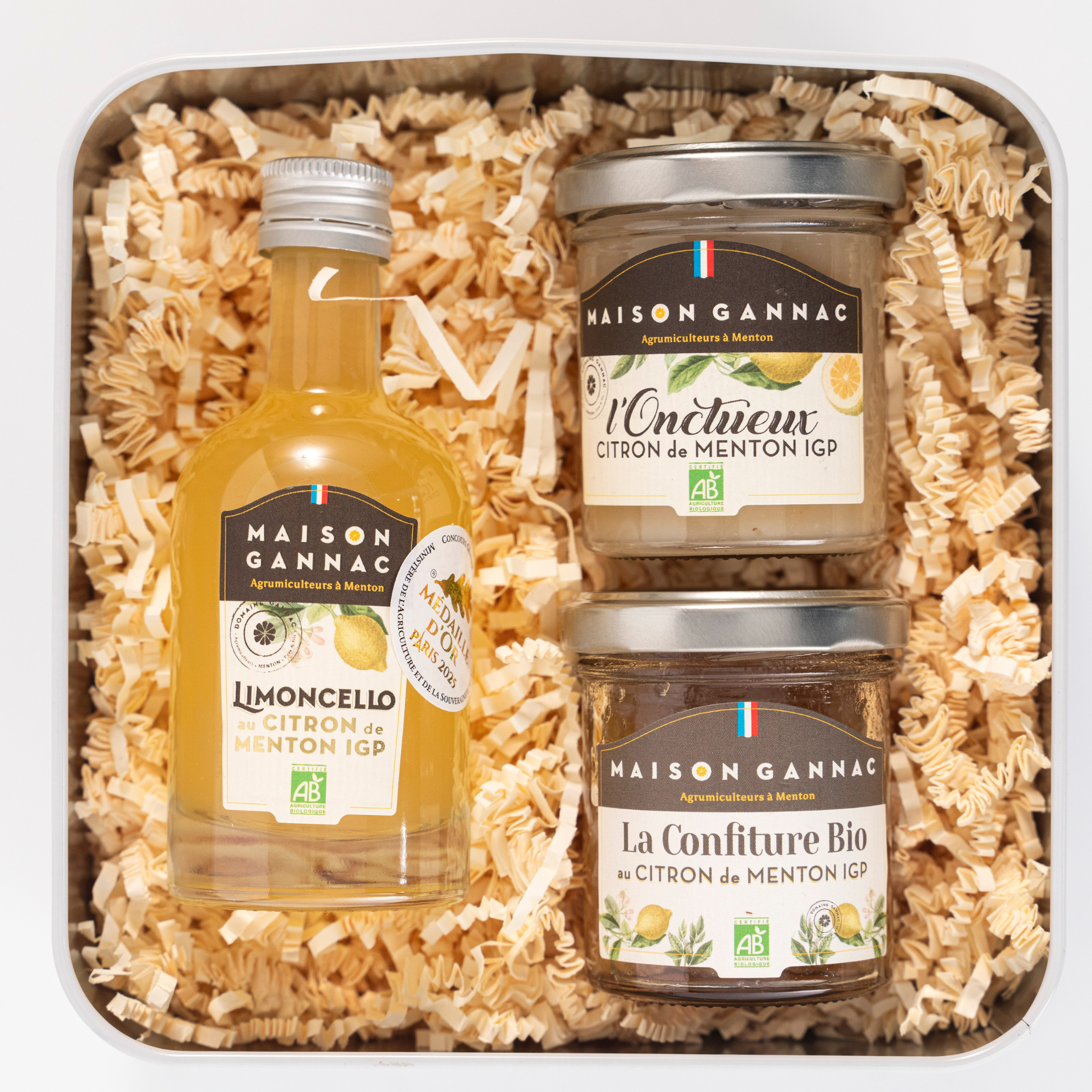 Ce coffret se compose d'un Limoncello BIO médaille d’argent au Concours général agricole en 2023 (10 cl), une confiture BIO au Citron de Menton IGP (100g) et un Onctueux BIO au Citron de Menton IGP qui tire son originalité et son goût du ziste de l’agrume (100g).