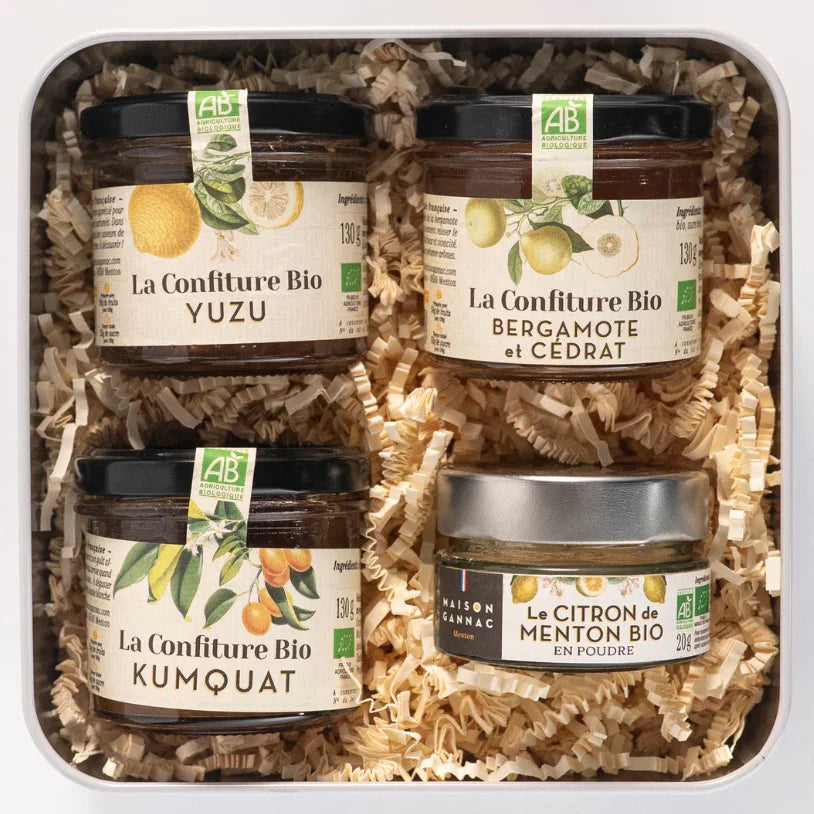Composition du coffret : Confiture Bio de Yuzu (130g), Confiture Bio de Kumquat (130g), Confiture Bio Cédrat & Bergamote (130g) – Une alliance étonnante de fraîcheur et d’amertume élégante, Poudre de Citron de Menton IGP Bio (20g).