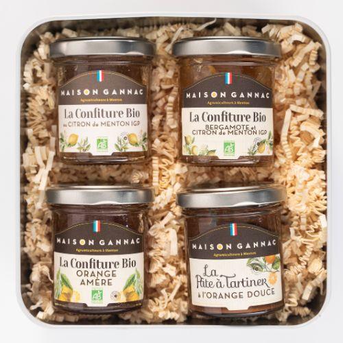 Offrez ou offrez-vous un concentré de saveurs ensoleillées avec notre Coffret Douceurs d'Agrumes Maison Gannac ! Dans une élégante boîte métal décorée, découvrez 4 pots de tartinables aux agrumes :