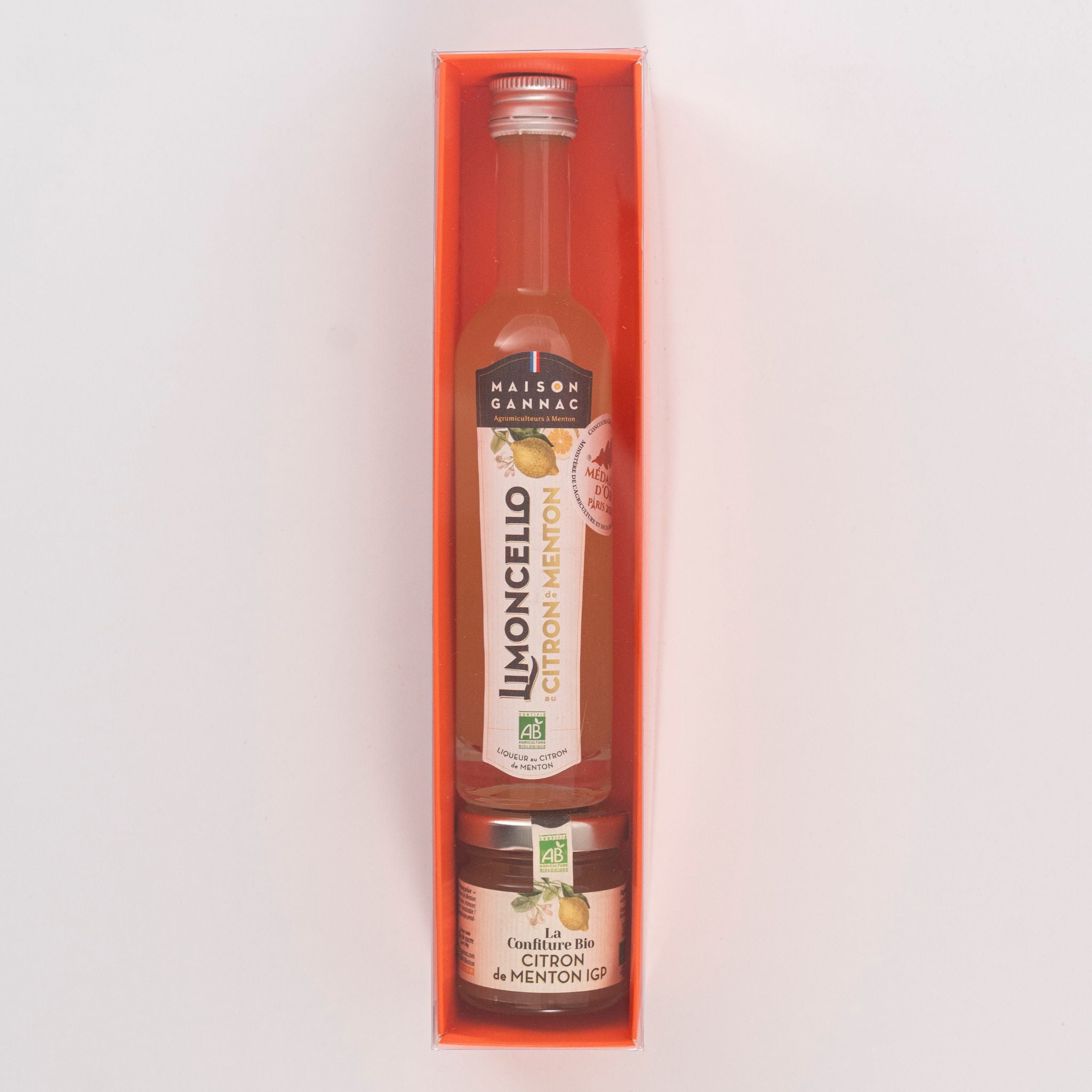 Ce coffret est composé d'un Limoncello BIO au Citron de Menton IGP (médaille d'argent au concours général agricole Paris 2025) 10 cl et d'une confiture BIO au Citron de Menton IGP 35 g.