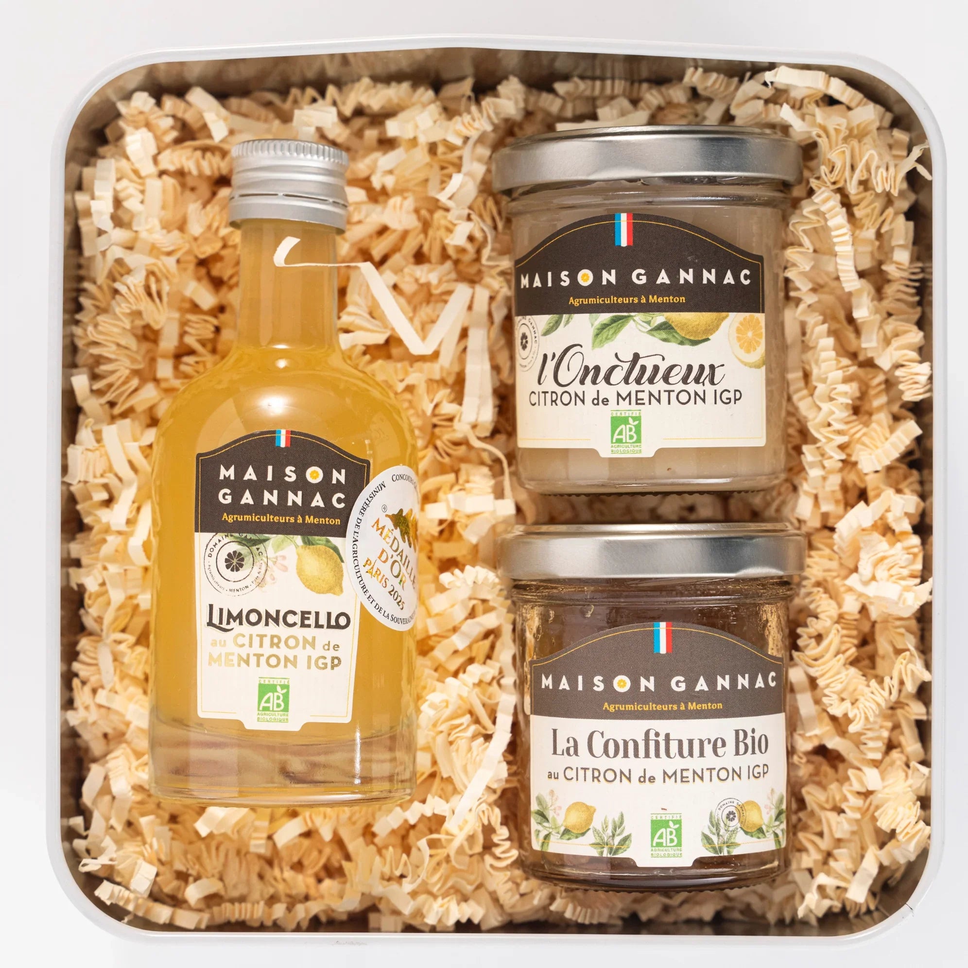 Ce coffret se compose d'un Limoncello BIO médaille d’argent au Concours général agricole en 2023 (10 cl), une confiture BIO au Citron de Menton IGP (100g) et un Onctueux BIO au Citron de Menton IGP qui tire son originalité et son goût du ziste de l’agrume (100g).