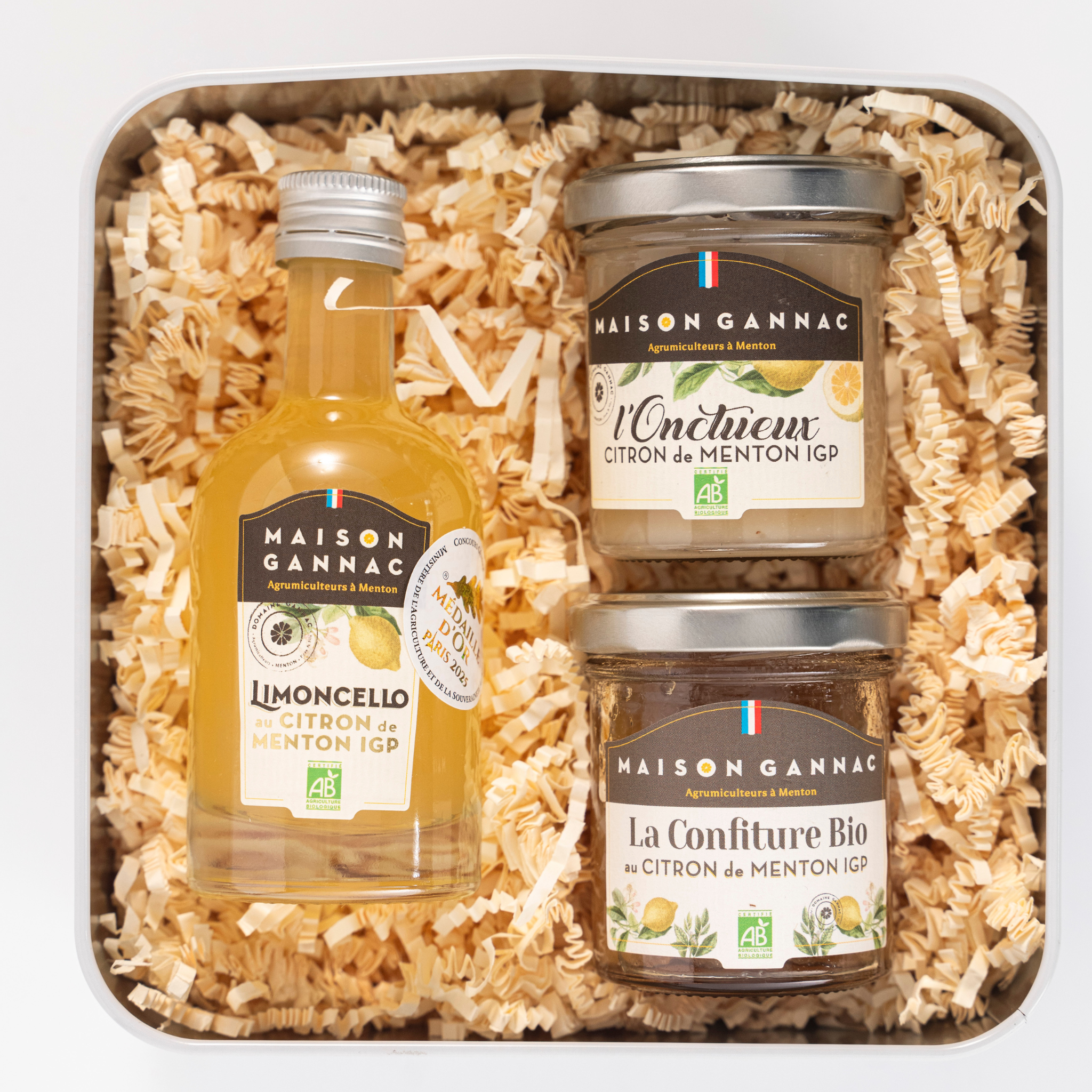 Ce coffret se compose d'un Limoncello BIO médaille d’argent au Concours général agricole en 2023 (10 cl), une confiture BIO au Citron de Menton IGP (100g) et un Onctueux BIO au Citron de Menton IGP qui tire son originalité et son goût du ziste de l’agrume (100g).