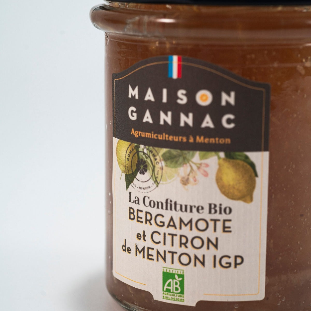 Agrumes Bio (bergamote et Citron de Menton IGP), sucre Bio. Préparée avec 50 g de fruits pour 100 g. Teneur totale de 55 g de sucre pour 100 g.