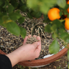 Répartition : ¼ au fond du trou ameubli, ½ en mélange avec la terre du trou et le terreau de plantation, ¼ en surface avant paillage de la cuvette de plantation.
